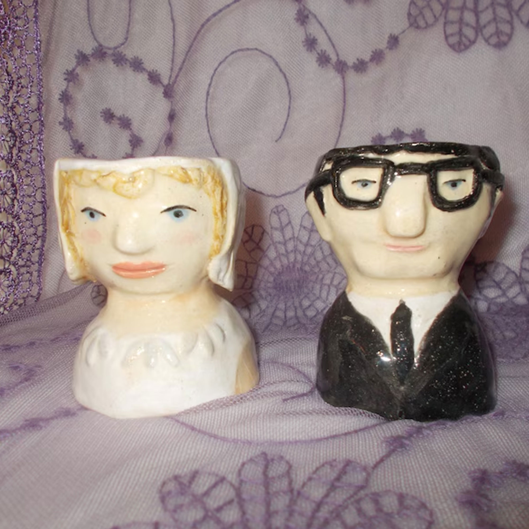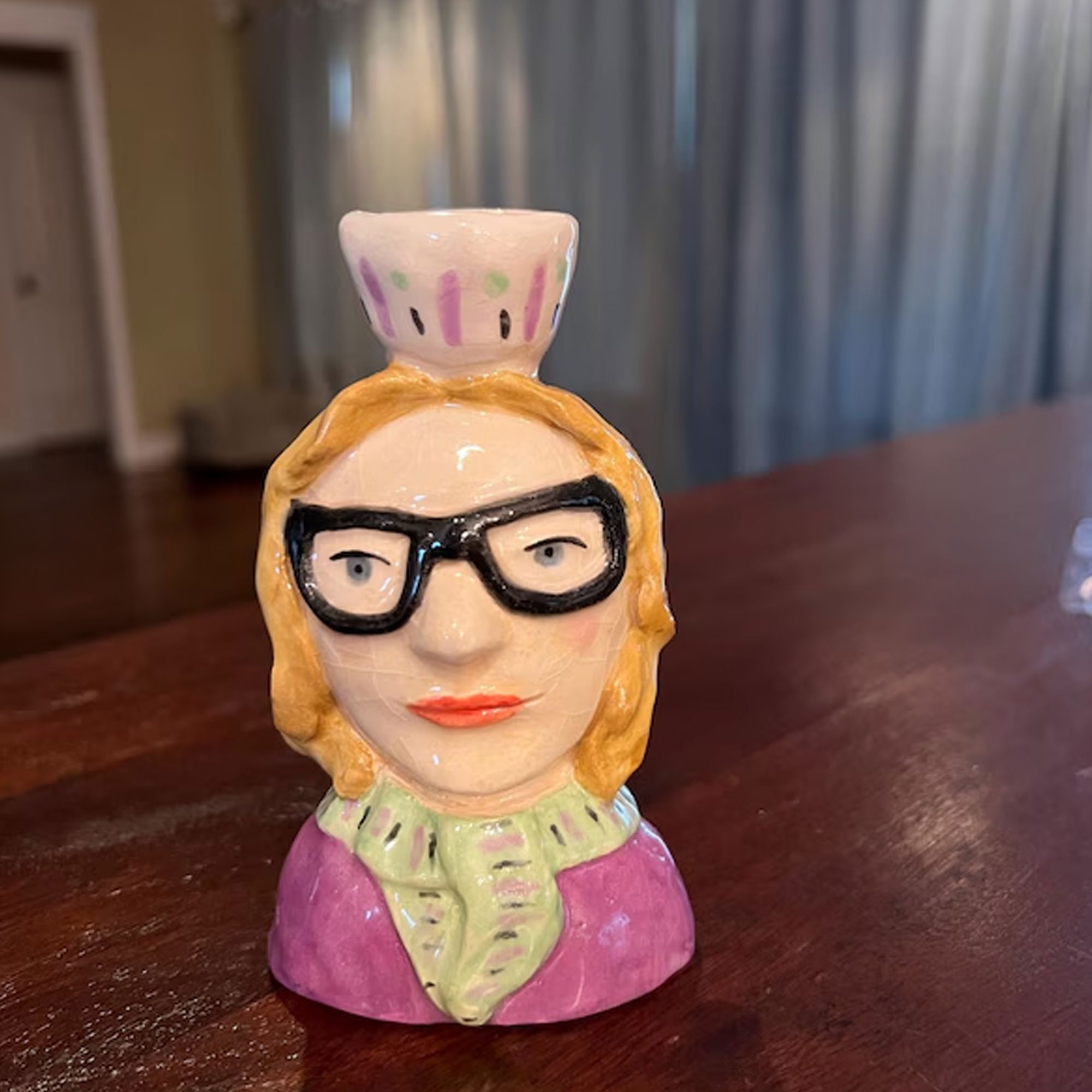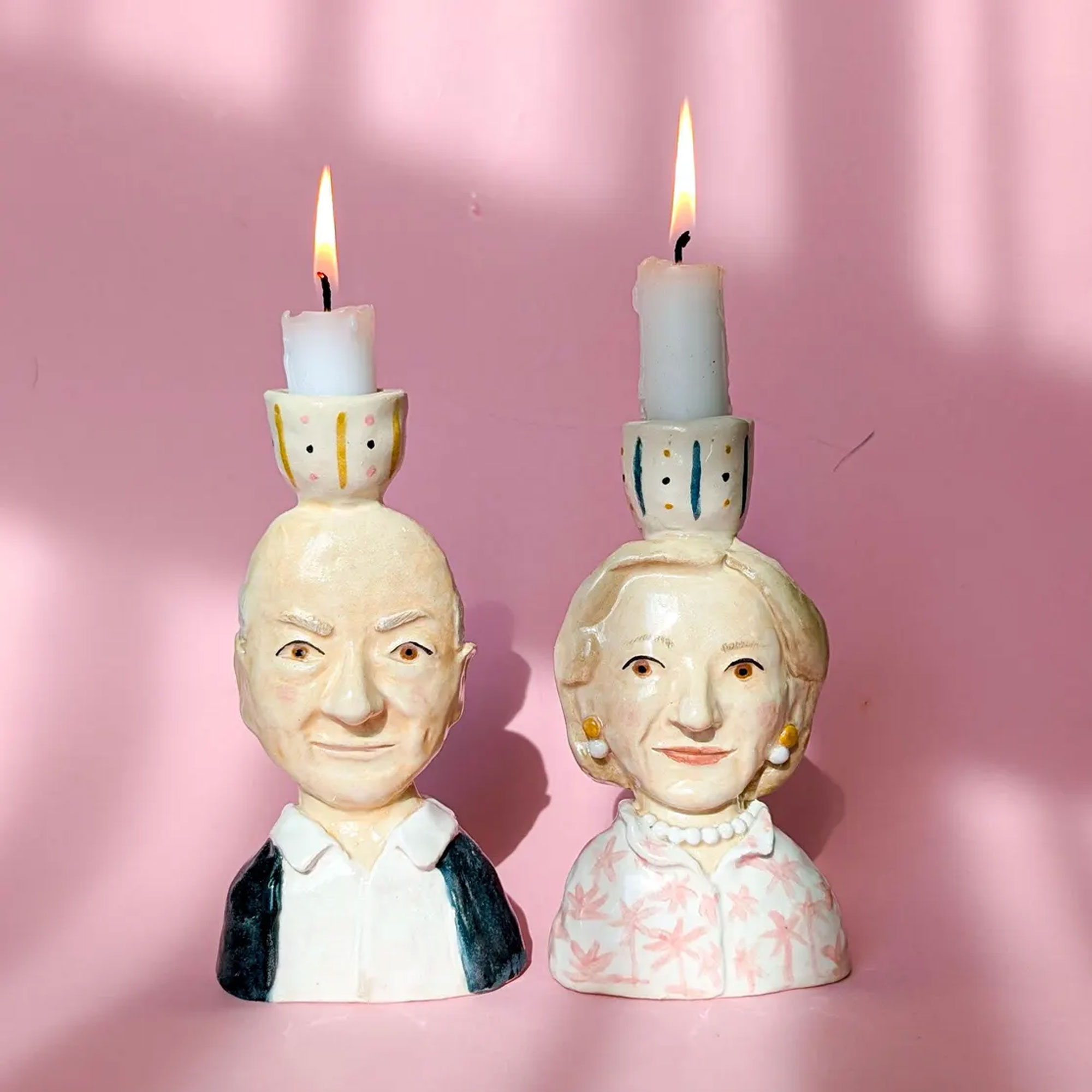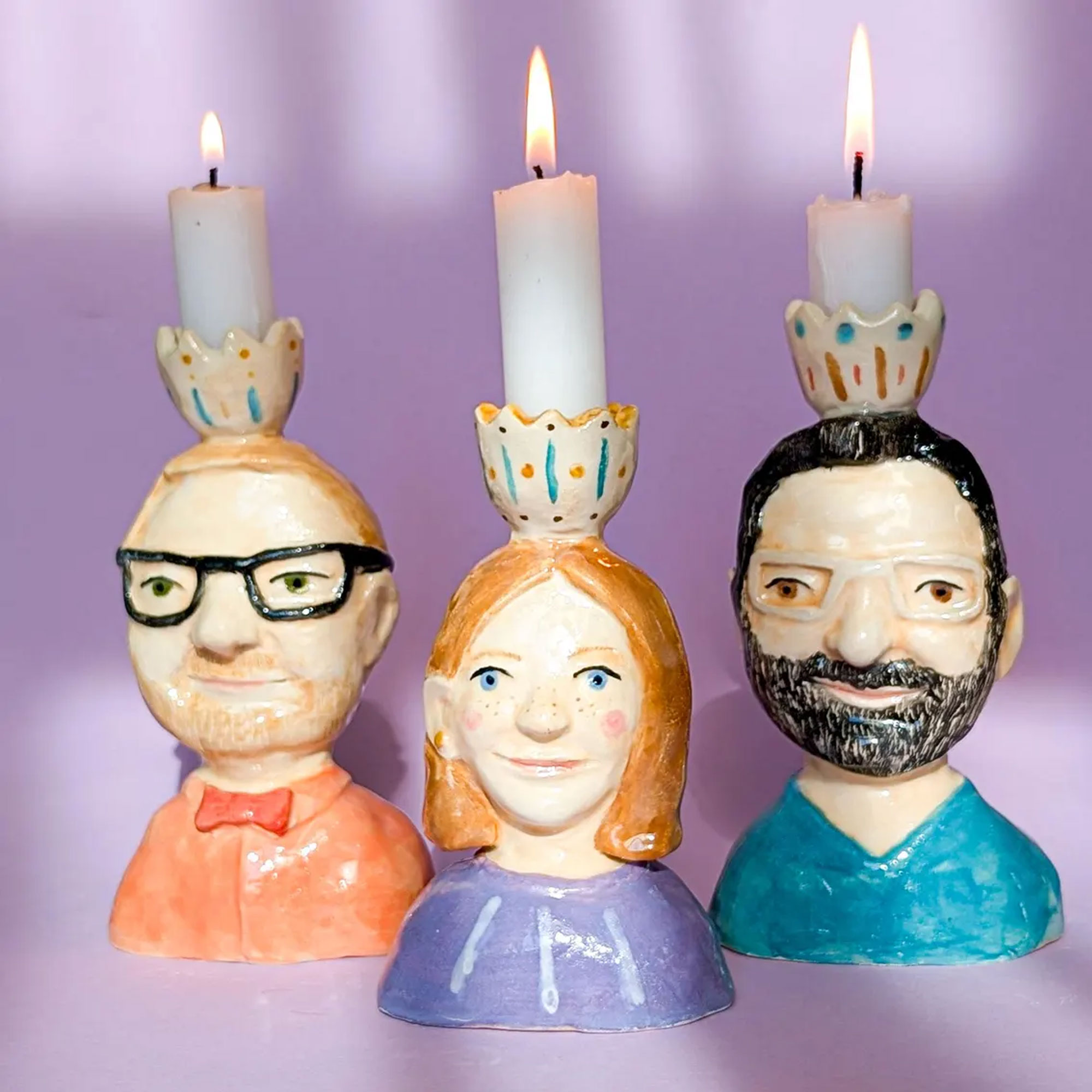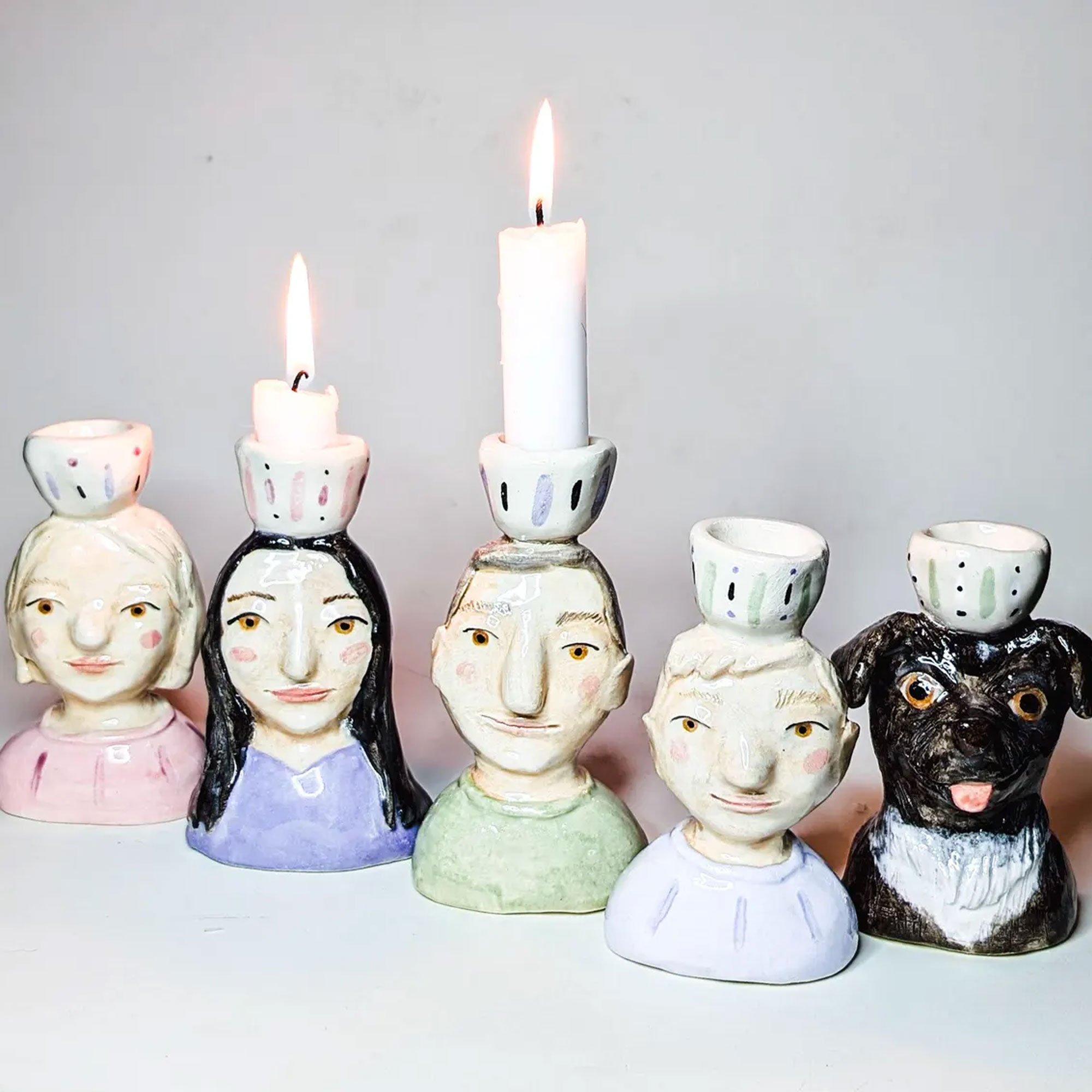 Whimsical Handcrafted Design – These unique ceramic candle holders feature hand-painted portrait busts of individuals or pets, each with distinct facial features, hairstyles, and outfits. The charming, expressive faces bring character and personality to every piece, transforming simple candles into a playful and heartfelt display of love and memory.